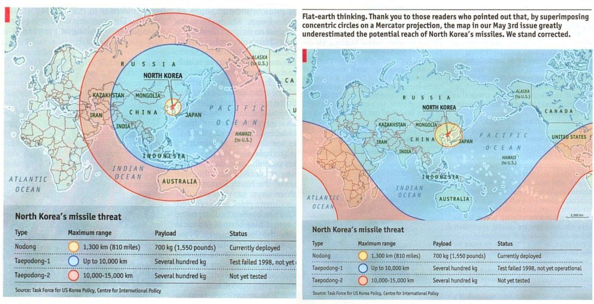 The Economist hat den Fehler auch schon mal gemacht. Bei der räumlichen Analyse muss man eine passende distanztreue Projektion wählen