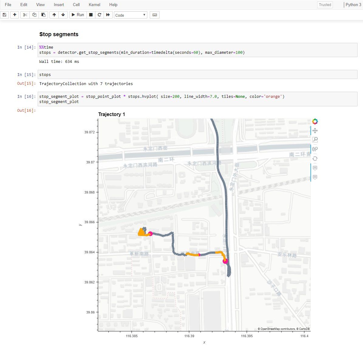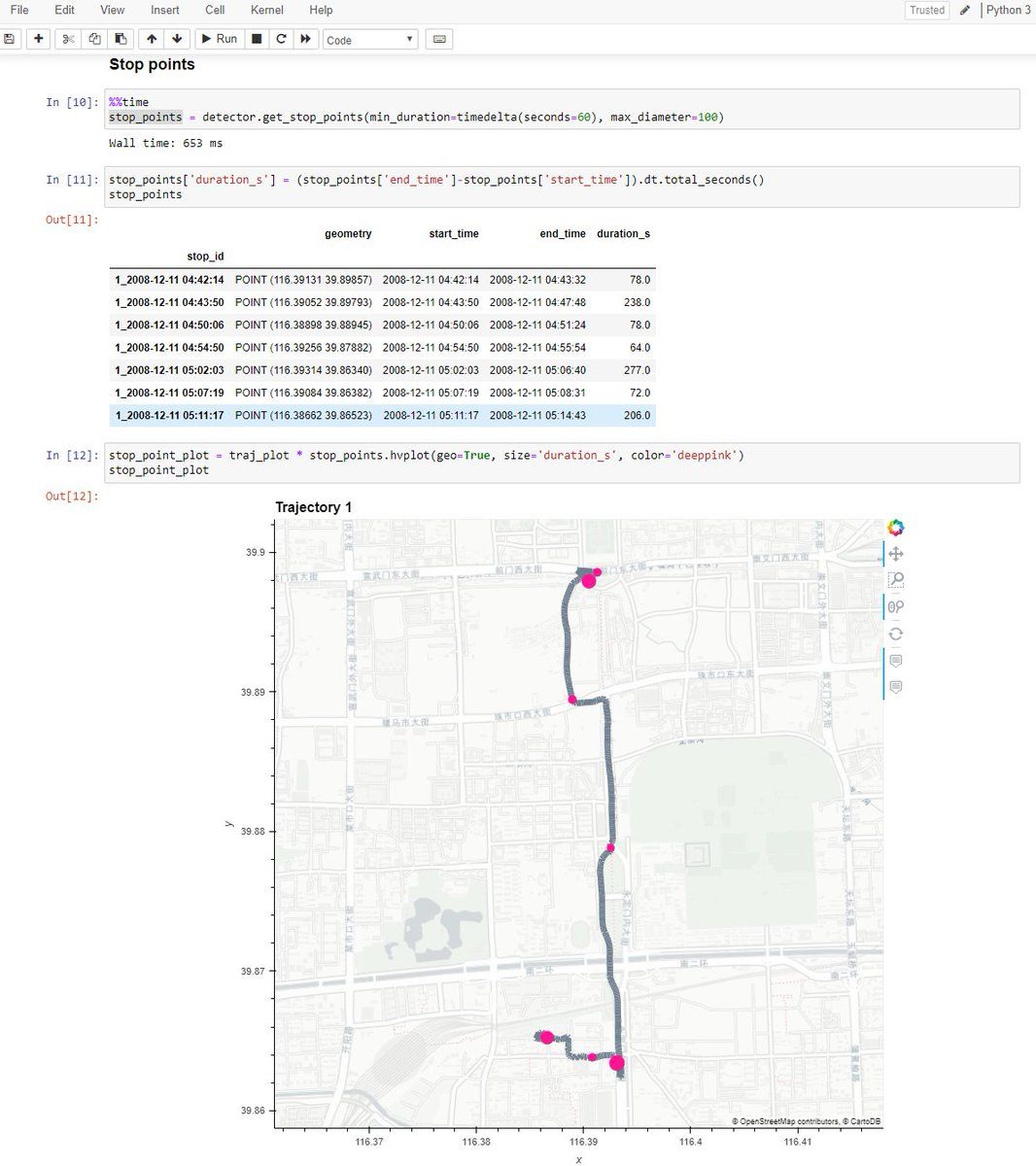 1. Inspired by last week's analyses, the next #MovingPandas release will include a new convenience function for extracting stops as points. Still considering different options for computing the stop location: stop segment start, end or center point or weighted in some way?